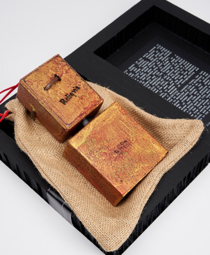 “Reliquia” è quindi un luogo per incontrarsi per rievocare la memoria, per ricordare il tempo che passa e che diventa oro solenne e autentico, messaggio di corruttibilità e incorruttibilità. “Reliquia” è la traccia concreta, l’ultima traccia, per descrivere in vita un’esistenza sopra di noi, diversa e prodigiosa. È l’armadio sempre chiuso, la custodia preziosa degli uomini sacri che ci fa capire che il tempo è prezioso e che rischia di consumarsi senza lasciarci un solco chiaro nella vita. “Reliquia” è il chiodo della Passione, incenso stratificato e torbato dagli anni solenni e sacri. Non c’è il sacro se gli uomini del sacro non lo riconoscono come tale e lo esaltano nei riti perfetti. “Reliquia” è il perfetto spazio del sacro. Toccare le reliquie, toccare qualcosa che sia stato a contatto con esse è una grazia e una garanzia: per questo i romani straziavano i veli che avevano rivestito i santi martiri e nei quali erano avvolti i cadaveri dei pontefici. Per questo i pontefici erano avvolti proprio in quei veli. Al cospetto delle reliquie sono risanati i mentecatti e liberati gli indemoniati e gli ossessi, i ciechi ritrovano la vista, gli zoppi ricominciano a camminare…